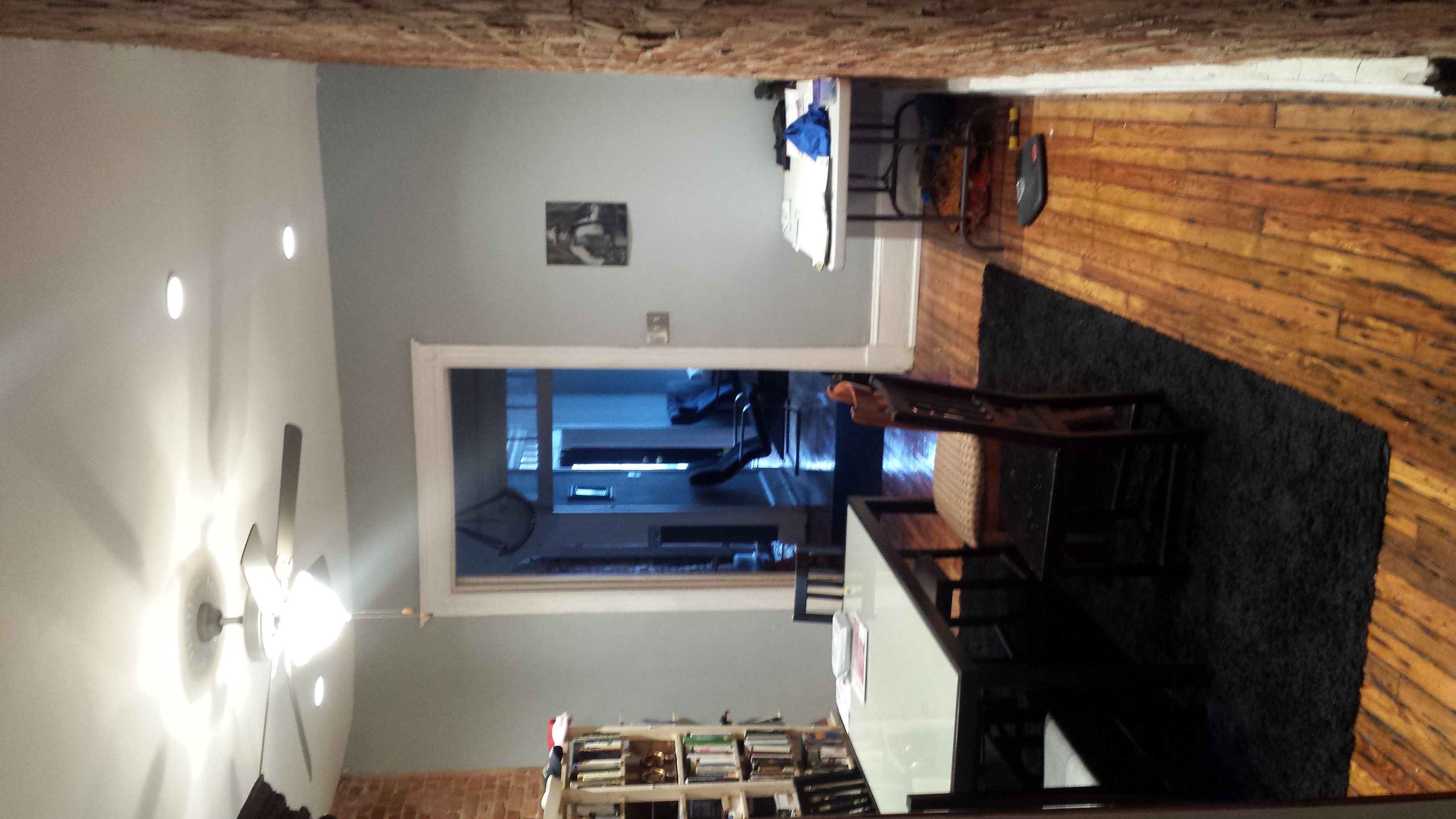 The furnished room is gorgeous!!! In fact, it’s almost a whole floor, which includes private full bath, spacious closet, double-windows, and ceiling fan and light. In addition there is a semi-private workout/living room area and an open-air balcony at $1,250/month. The living room contains is an Apple TV, workout equipment, and armchairs. The bedroom is furnished with a queen bed, night stand, shelves, chair, and table. Included in the rent is high-speed wifi, parking, storage, common kitchen items, and a monthly professional cleaning.