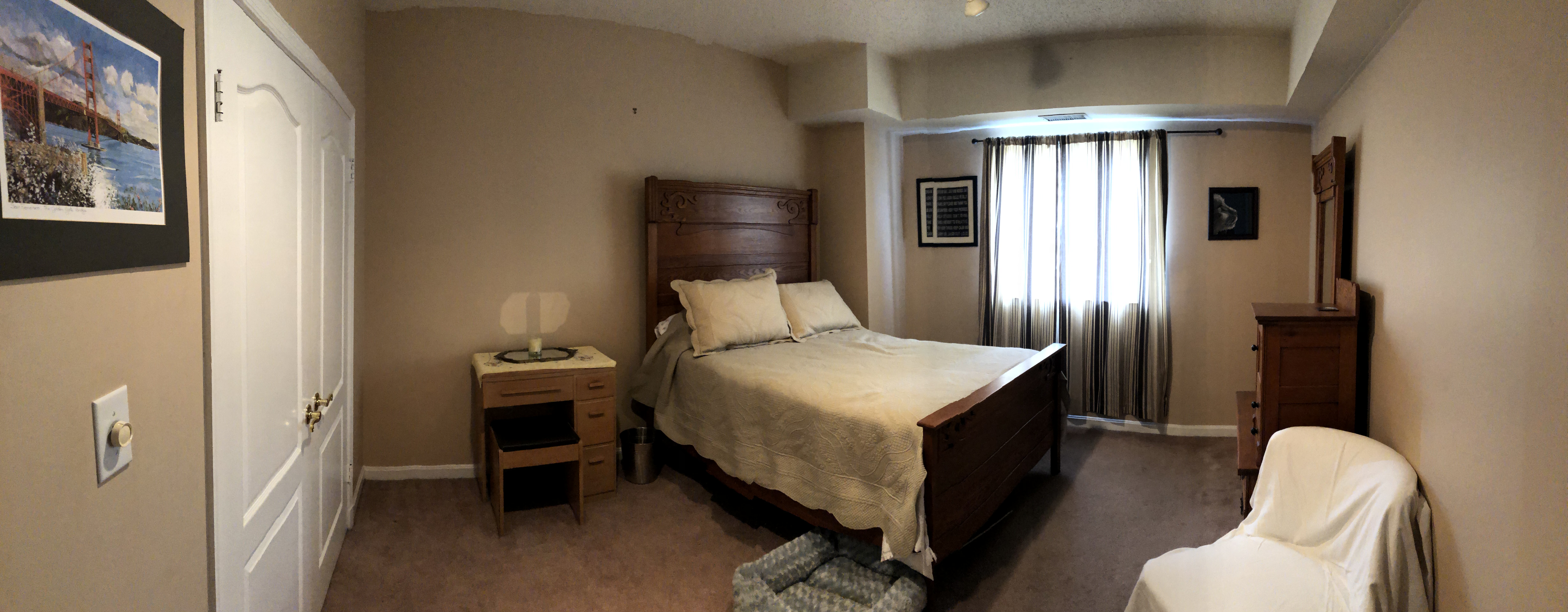 The room is gorgeous!!! In fact, it’s almost a whole floor, which includes private bath, spacious closet, double-windows, and ceiling fan and light. In addition there is a semi-private workout/living room area and an open-air balcony at $1,250/month. The living room contains is an Apple TV and armchairs. The bedroom is furnished with a queen bed and table. Included in the rent is high-speed wifi, parking, storage, common kitchen items, and a monthly professional cleaning.