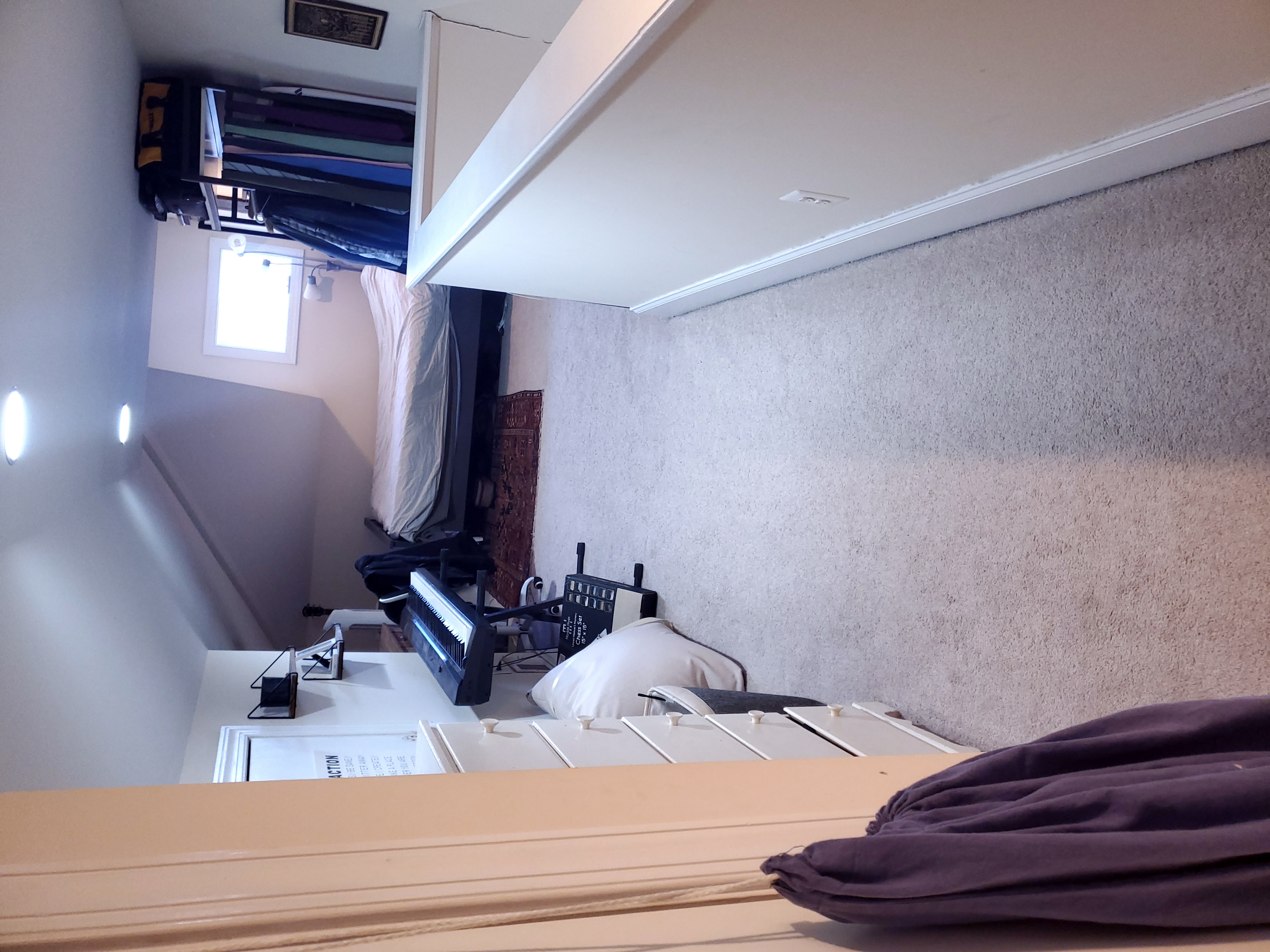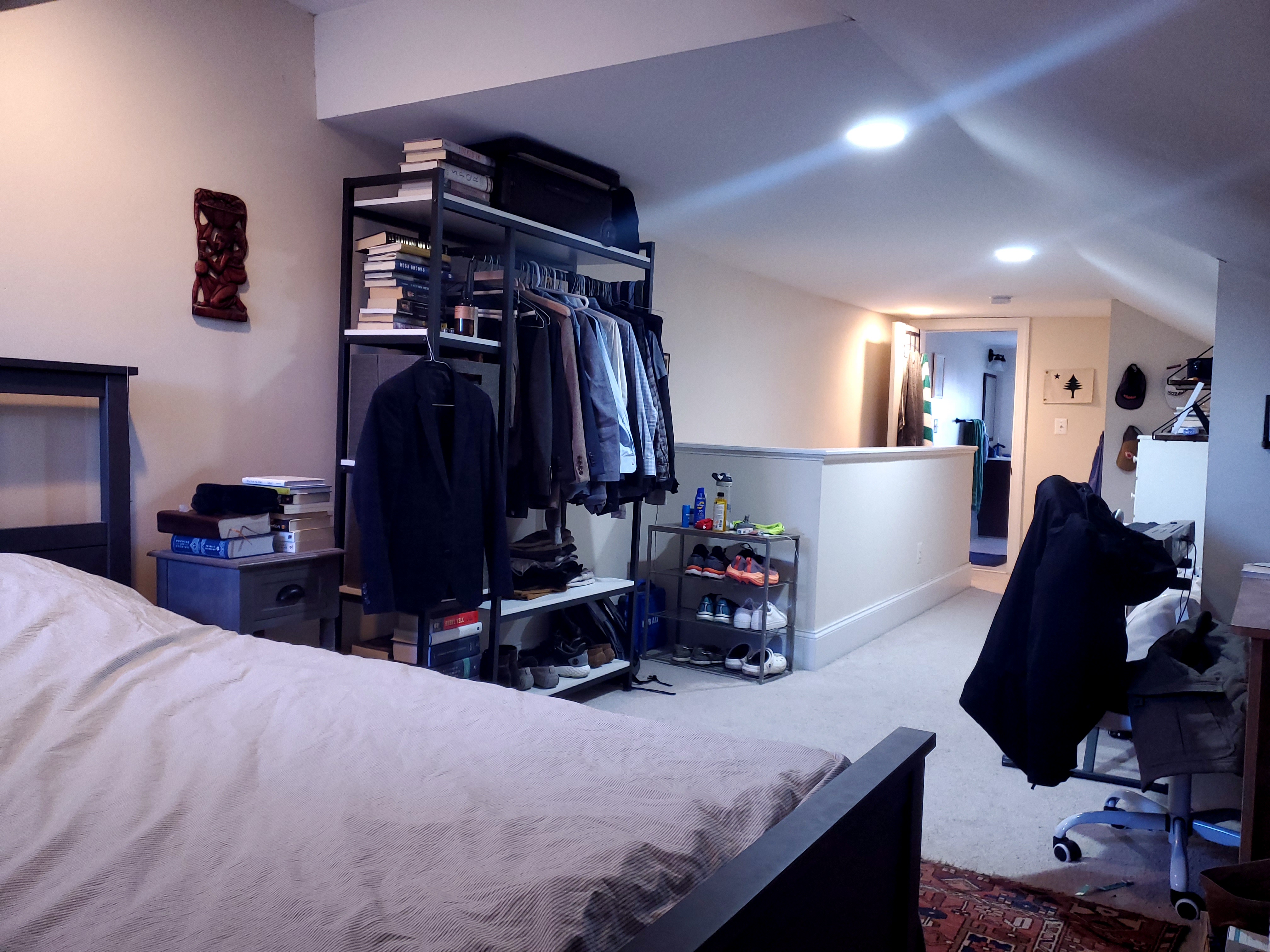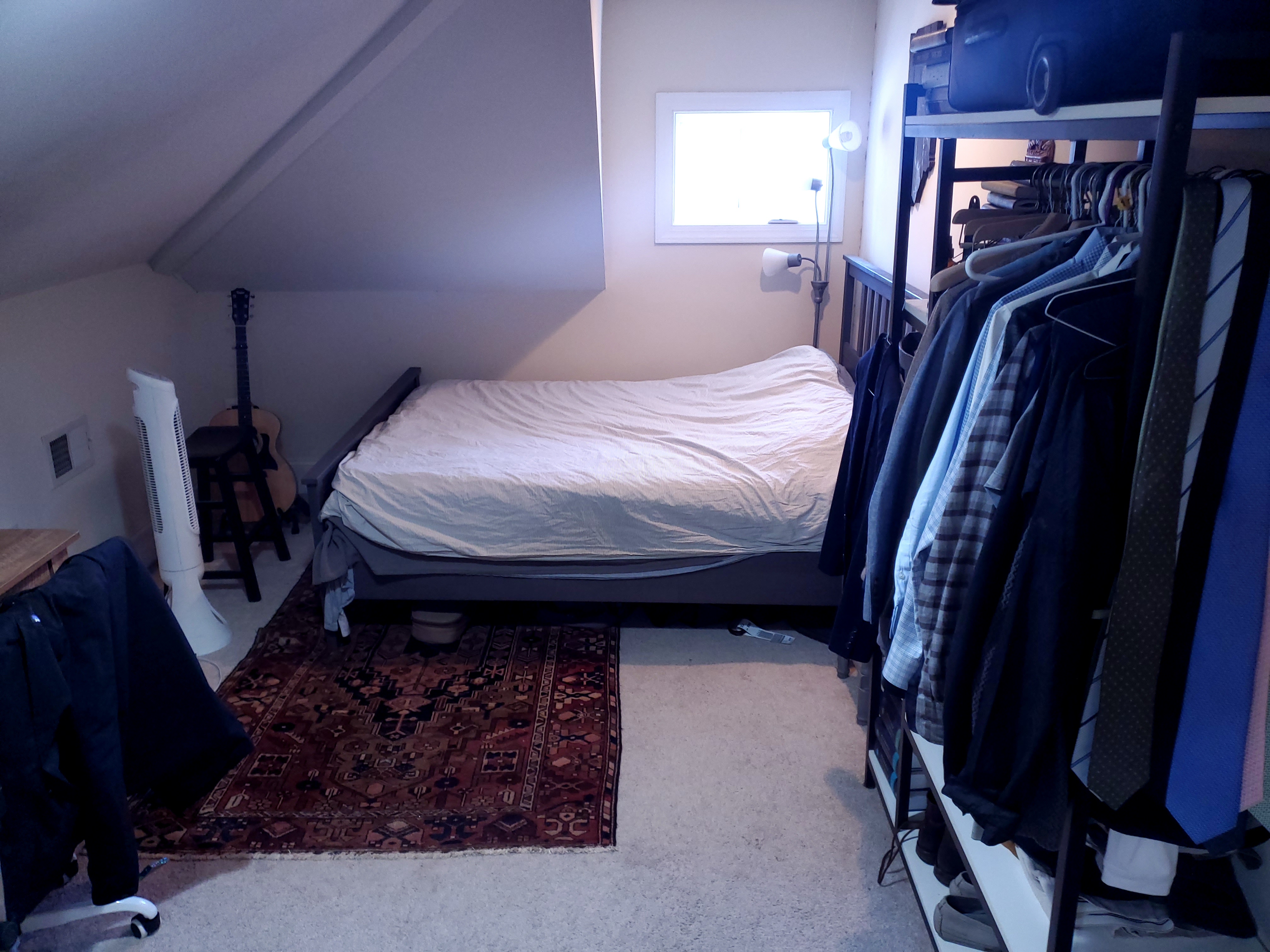 About the room: The room is a spacious, rectangular space of around 150 square feet on the top floor of the house, with a full bathroom. It’s carpeted and offers plenty of open floor space. There’s also tons of wall space for decorations, and since it’s set apart from the rest of the house, it provides a nice sense of privacy. The outgoing roommate is selling all the furniture currently in the room, including a standing wardrobe, dresser, bed frame, and desk with a chair, so you’d have a ready-made setup if interested. The bathroom is fully attached to the room, but partially shared with the ground-floor roommate, since his level only has a half-bath. You’ll have the space to yourself most of the time; there will be some shared use for showering.