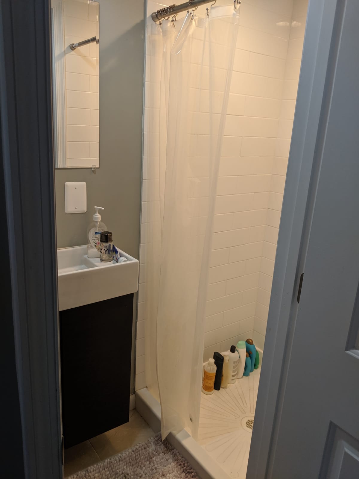 Nicely furnished bedroom with window and closet. The room is furnished with a queen bed, desk, office chair, and lamp. The bathroom is shared with one roommate.