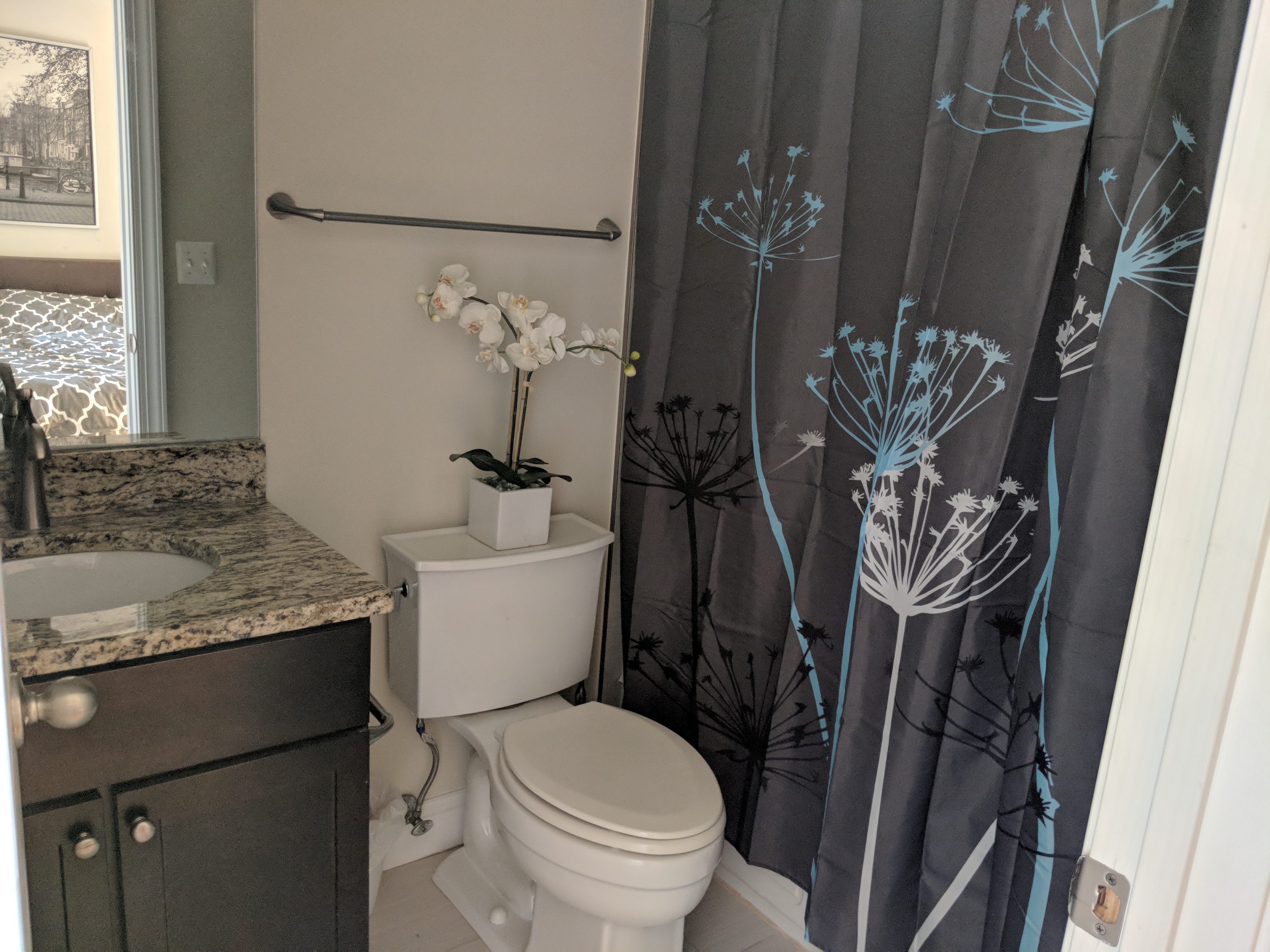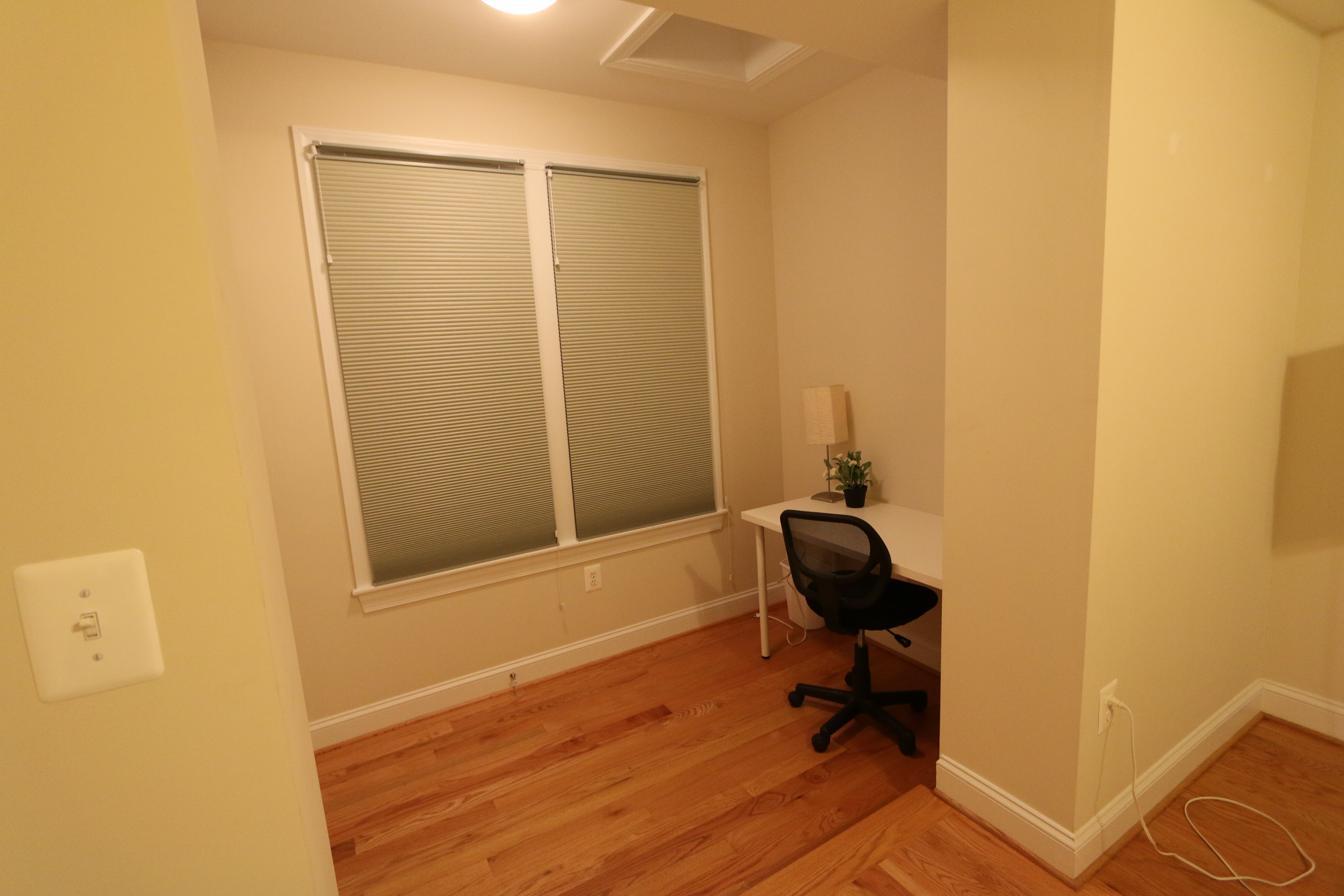 Nicely furnished master bedroom with desk, full-size bed, large closet, and a private bathroom with skylight. The house is three stories and this room is on the top floor and an optional parking space for $50.
