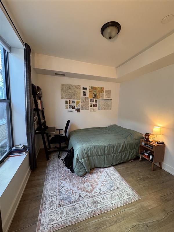 Bedroom available in 3bd 2ba beginning May 1 through end of June or later (end date is flexible), and rent is $1130/mo. The room has two large windows, a spacious closet, and it shares a bathroom with one other roommate. The two roommates are CFs in their 20s who both work in international human rights.