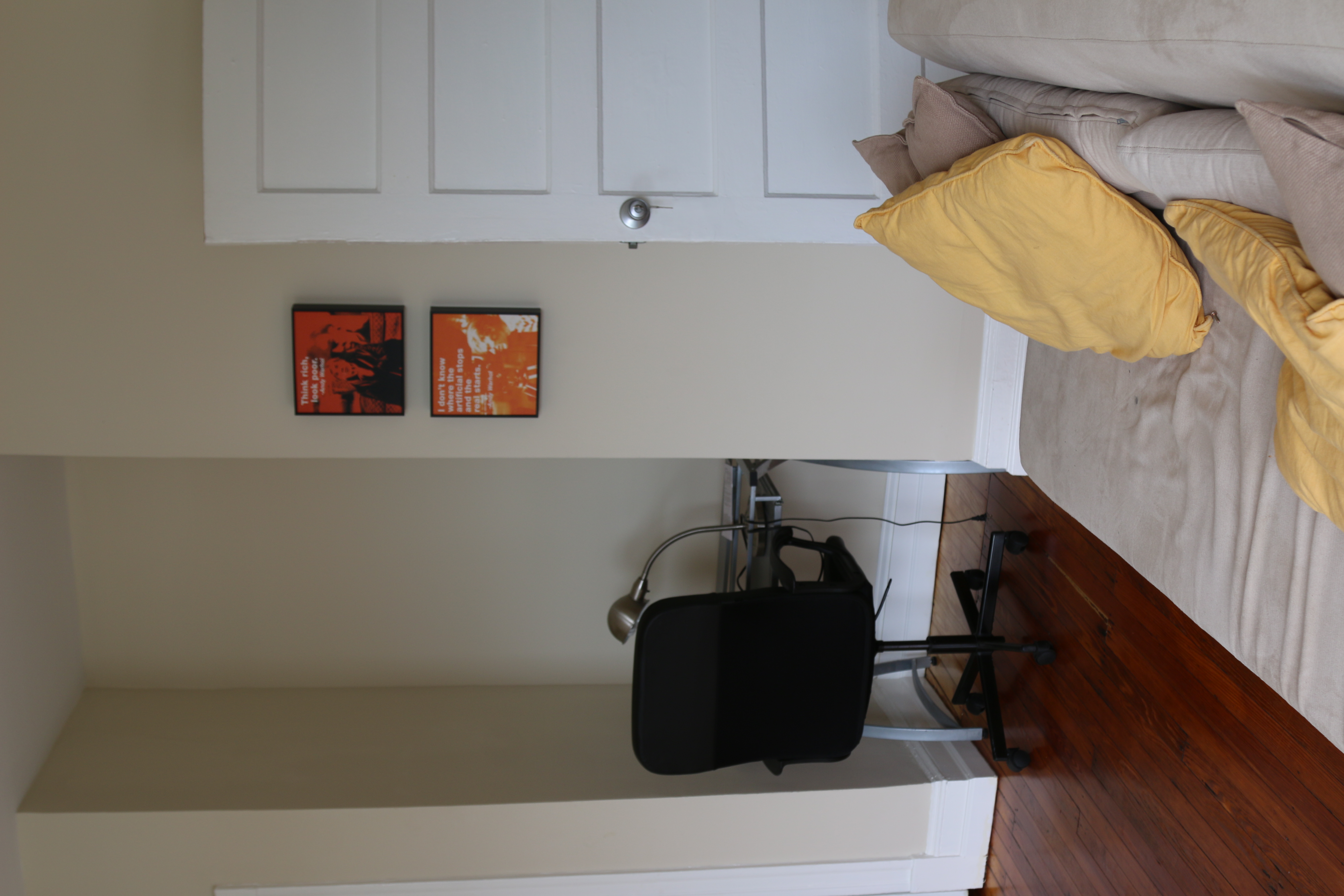 Furnished room with a bed, couch, desk, lamp, computer chair, and closet. The house has two living rooms, 3 bathrooms, and a washer and dryer. The kitchen has 2 refrigerators and a dishwasher.