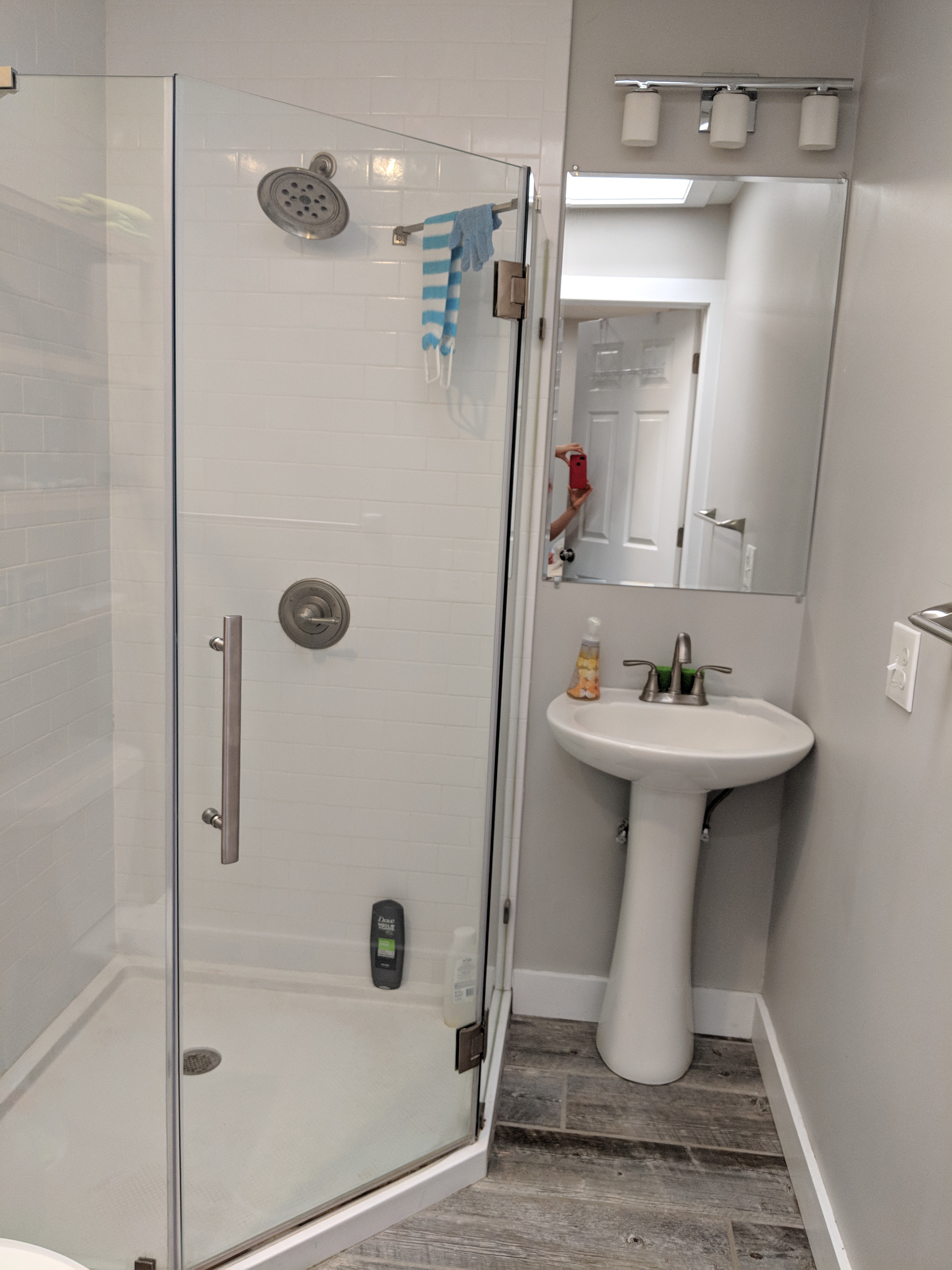 Nicely furnished master bedroom with a comfortable full-size bed, spacious closet, and a private bathroom illuminated by a skylight.